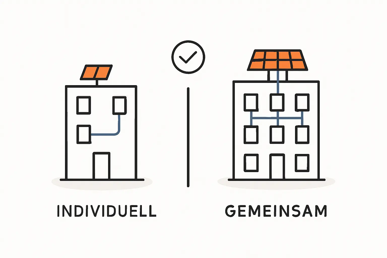 Eine oft effizientere und wirtschaftlichere Lösung ist die Installation einer größeren Photovoltaikanlage durch die Eigentümergemeinschaft selbst. Der erzeugte Strom wird dann an die teilnehmenden Eigentümer verteilt. Das Modell der „Gemeinschaftlichen Gebäudeversorgung“ nach dem EEG 2023 hat diesen Ansatz erheblich vereinfacht.
