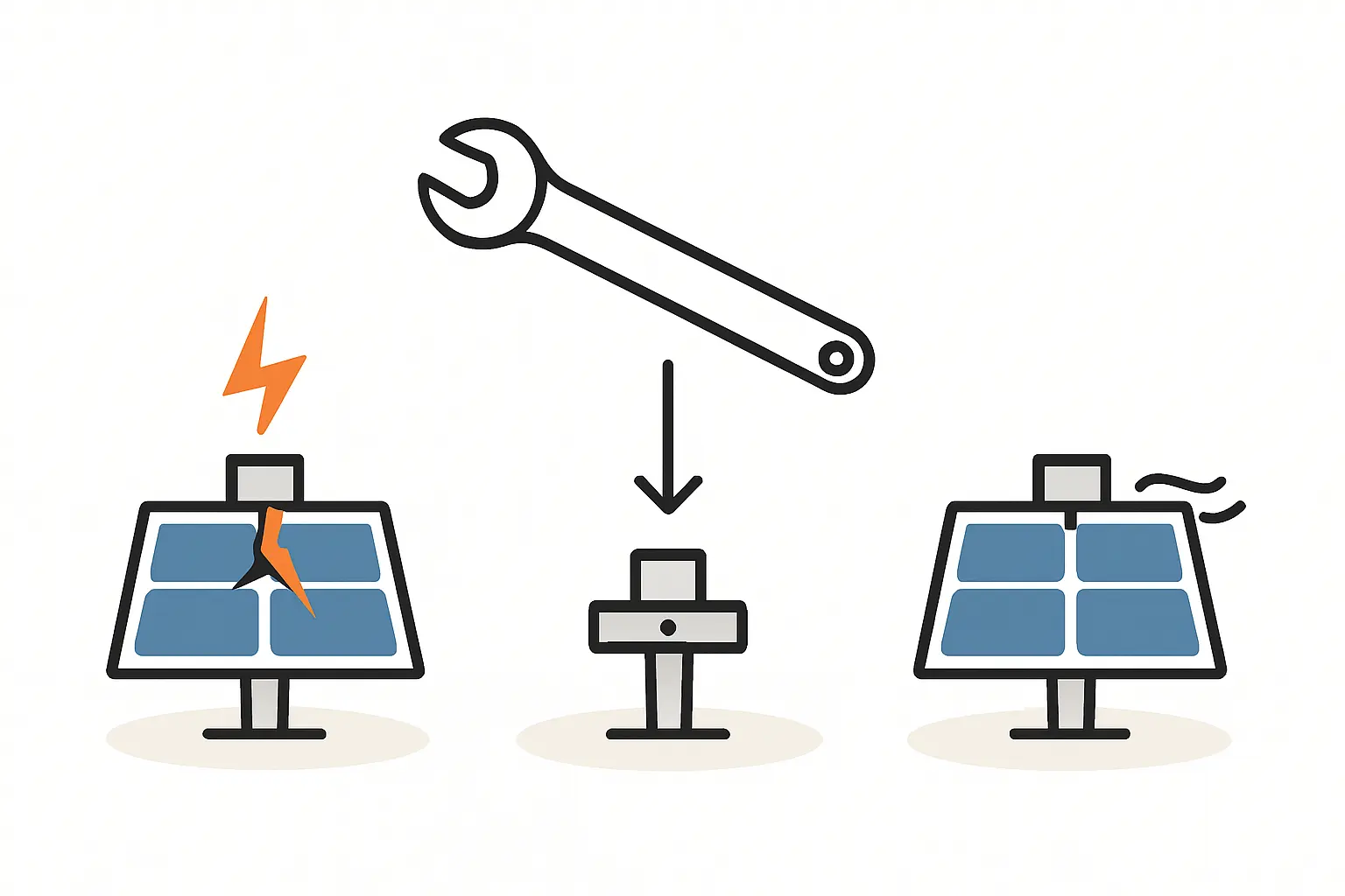 - Praxisbeispiel: Ein Herbststurm fegt über das Land. Eine nur handfest angezogene Modulklemme gibt unter der Last nach. Das Modul verschiebt sich um wenige Millimeter – eine Bewegung, die enormen mechanischen Stress auf die empfindlichen Solarzellen ausübt und zu unsichtbaren Mikrorissen führen kann. Diese reduzieren die Leistung des Moduls schleichend, aber dauerhaft. Im schlimmsten Fall lockert sich das Modul vollständig und wird zur Gefahr für Personen und Eigentum.