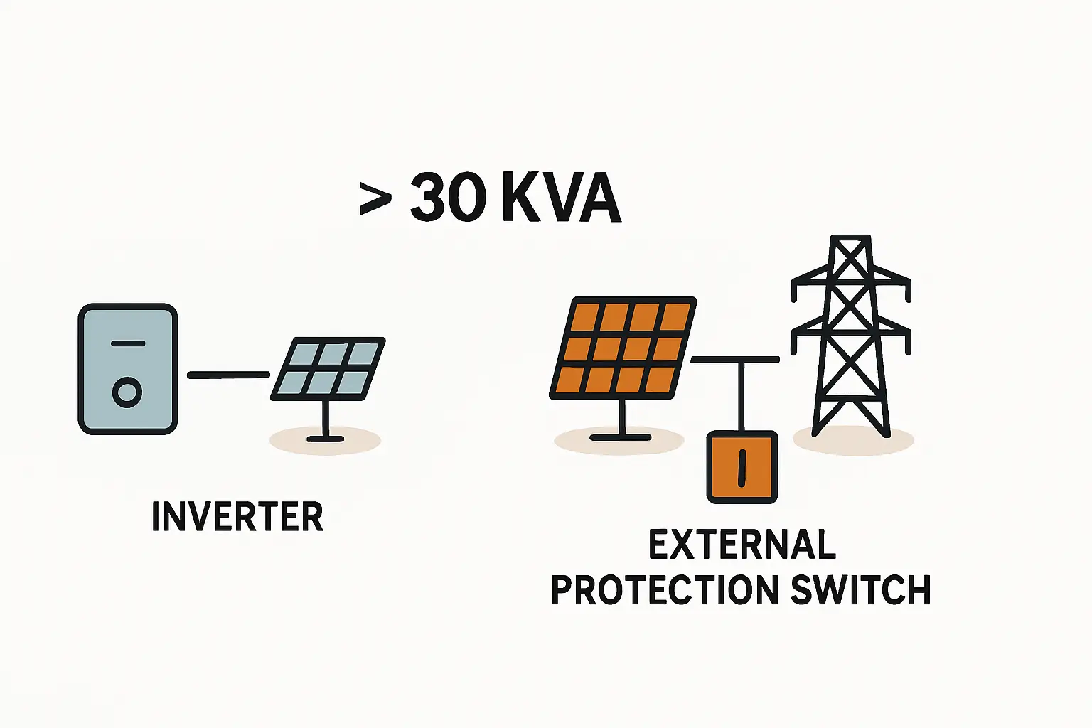 Die gesamte Erzeugungsleistung der Anlage übersteigt 30 kVA, was in der Praxis oft mit 30 Kilowattpeak (kWp) gleichgesetzt wird. Sobald Ihre Anlage diese Größe überschreitet, reicht ein integrierter Schutz nicht mehr aus.