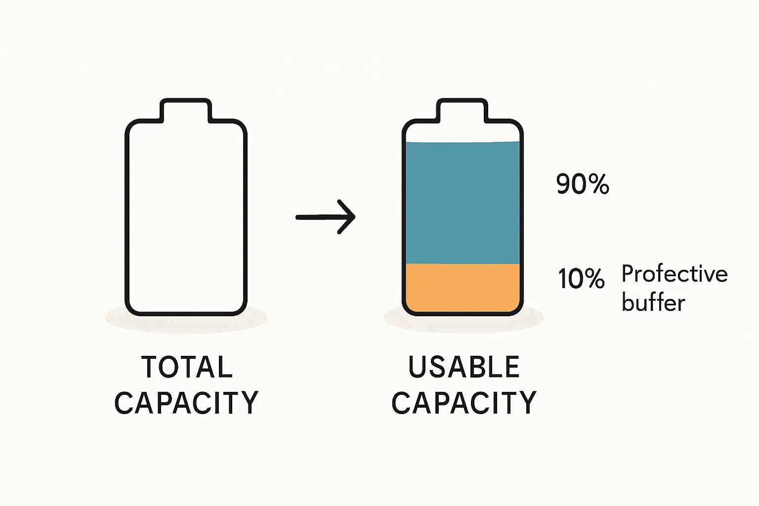 Während die Bruttokapazität die theoretische Gesamtenergiemenge angibt, bezeichnet die nutzbare Kapazität (auch Nettokapazität) jene Energiemenge, die Sie tatsächlich entnehmen können. Und diese ist immer geringer. Der Grund dafür ist eine Schutzfunktion: Um die Lebensdauer der Batterie zu maximieren und chemische Schäden zu vermeiden, wird sie nie zu 100 % entladen. Das Batteriemanagementsystem (BMS) riegelt die Entladung bei einem bestimmten Restwert ab.