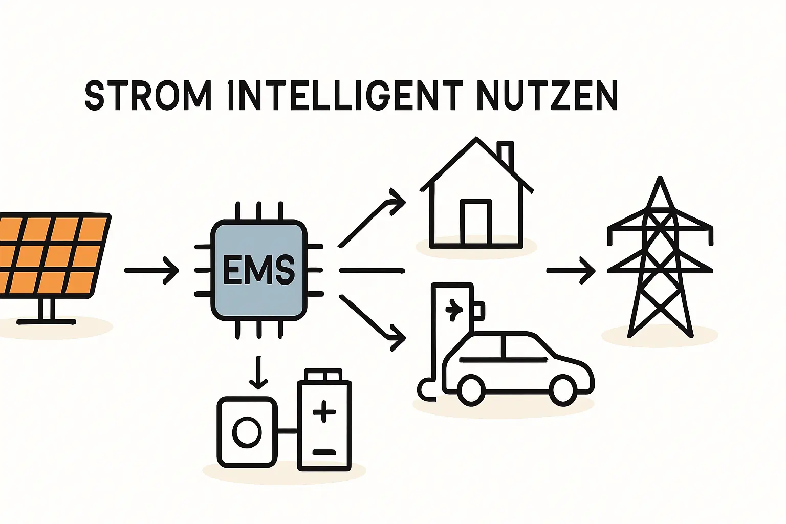 Praxisbeispiel: Ein EMS erkennt einen Solarüberschuss von 2,5 kW. Anstatt die Wallbox mit voller Leistung (z. B. 11 kW) zu starten und Netzstrom zu ziehen, regelt das EMS die Ladeleistung des E-Autos exakt auf die verfügbaren 2,5 kW. So wird ausschließlich kostenloser Sonnenstrom getankt.