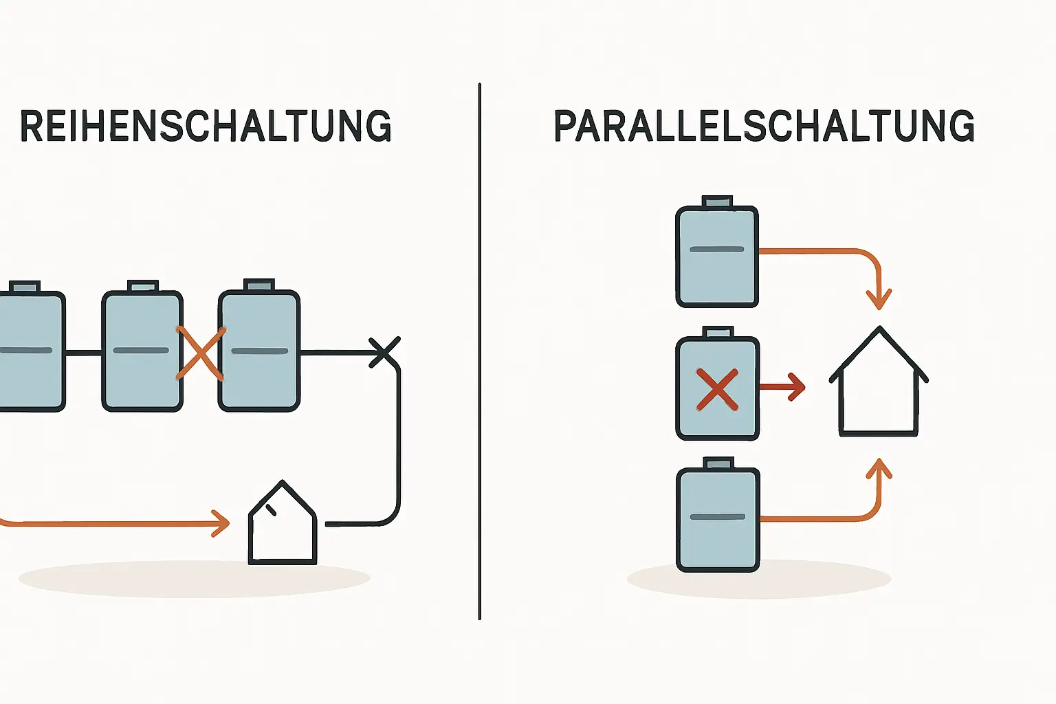Die Verschaltung der einzelnen Batteriemodule bestimmt die Robustheit des gesamten Systems. Dabei stehen sich zwei grundlegende Konzepte gegenüber: die Reihenschaltung bei Hochvolt-Speichern (HV) und die Parallelschaltung bei Niedervolt-Speichern (LV). In diesem Artikel erklären wir die technischen Unterschiede und zeigen, warum die Parallelschaltung oft die deutlich ausfallsicherere Wahl ist.